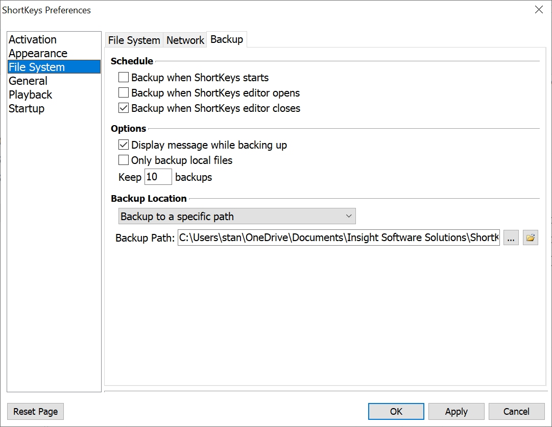 A backup of the ShortKeys macro file is created when the program loads. If the program is set to run on Windows startup, then the backup file is created at this time.
