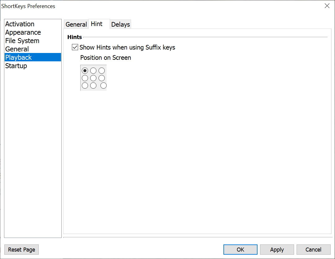 Click on the radio button that represents the area of the screen where the hint should appear. Choose from nine screen locations - one of the corners, midpoints, or the center of the screen.