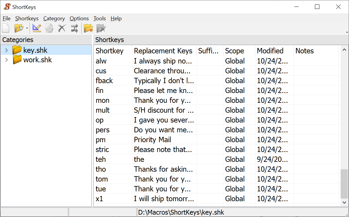 The ShortKeys window displays the current active list of shortkeys, the first portion of the replacement text and any suffixes used. It also displays any notes created about the shortkey and the last time the shortkey was modified.