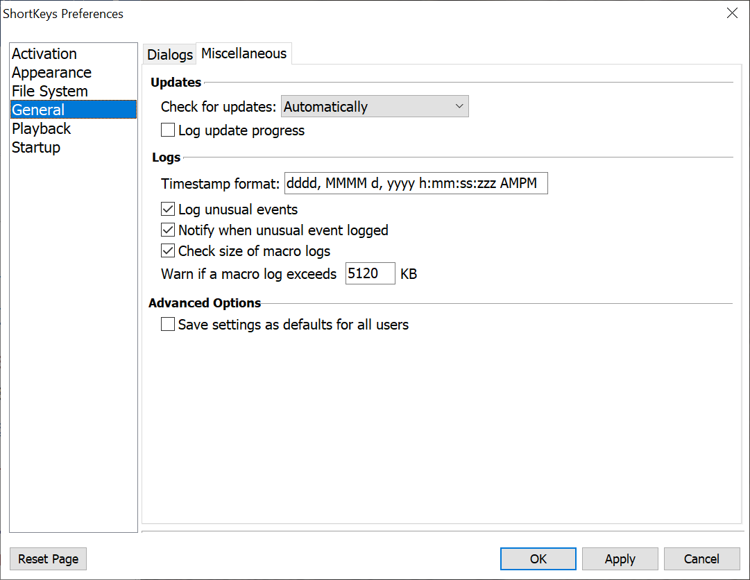 The macro log files can become quite large over time and potentially cause performance issues. This function will warn you if one of the log files is getting too large. A message appears on startup of ShortKeys stating that one or more log files may be getting too large.