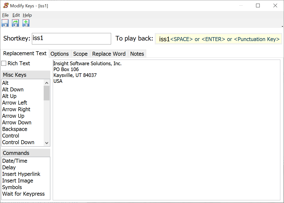 Displays a representation of what needs to be typed to run the shortkey macro. The example above shows that the prefix of // plus the text iss1 must be typed to play back the shortkey.