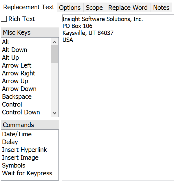 This tab contains the text that is played back into another application. Either type the replacement text into this field or copy and paste the text from another source. The Replacement Text field holds up to 65,000 characters of text.