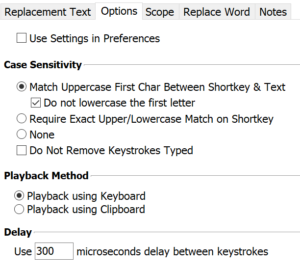 If using the Simulate Keystrokes playback method optionally choose to add a slight delay between each keystroke typed. This may be advisable for longer strings of text that may play back faster than the receiving application can accept the keystrokes.