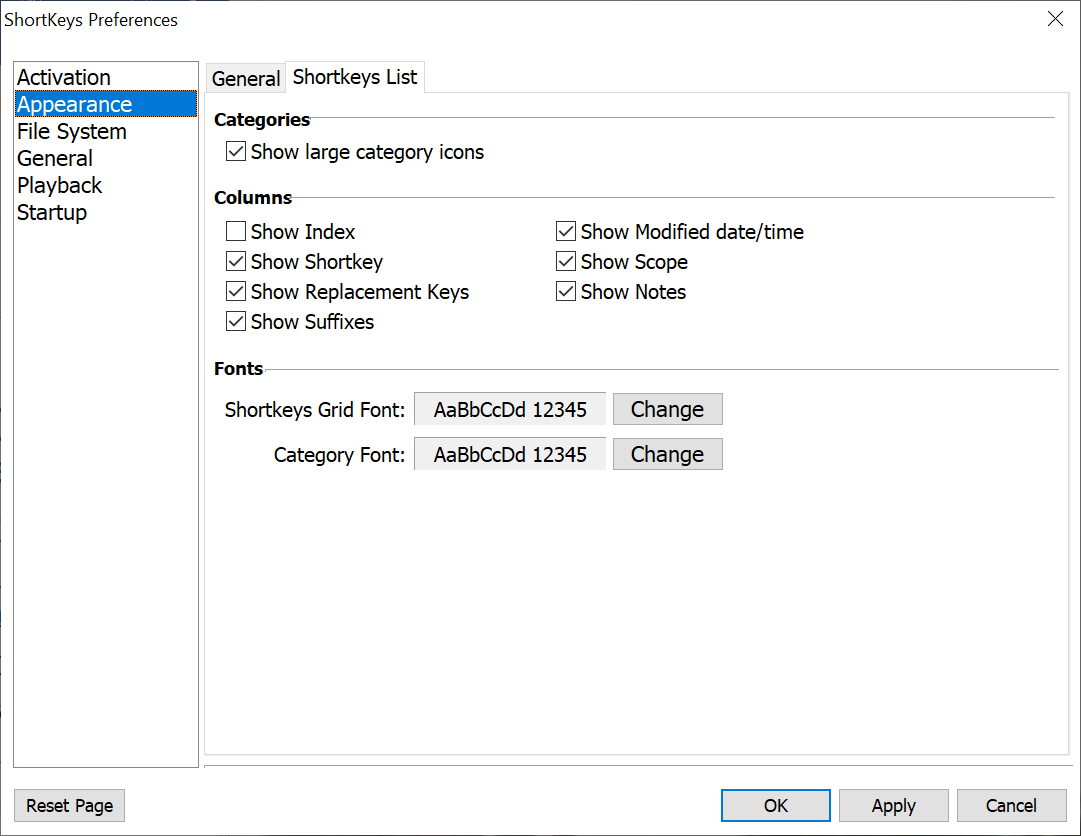 These options allow you to change what is displayed on the ShortKeys window and adjust the fonts.
