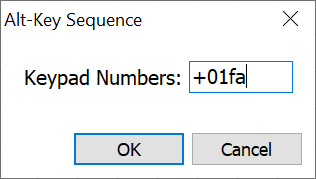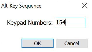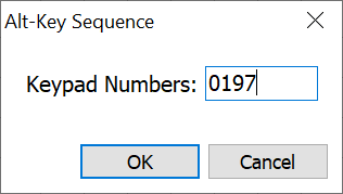 Use this option to embed an Alt-Key Sequence directly into a macro. The Alt-Key Sequence is a method for inserting symbols into most Windows applications and is done by holding the ALT key down and pressing digits on the keypad. Clicking on the "Alt-Key Sequence" button presents a window asking for the numeric digits that are typically typed via the numeric keypad.