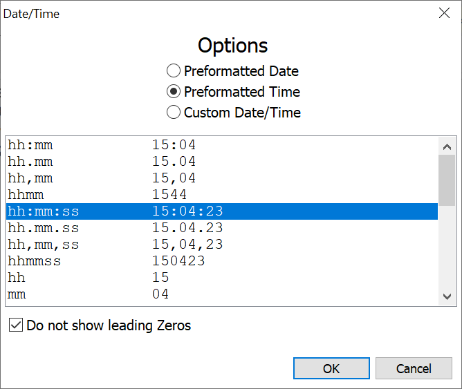 Modify Keys > Replacement Text > Date/Time > Preformatted Time