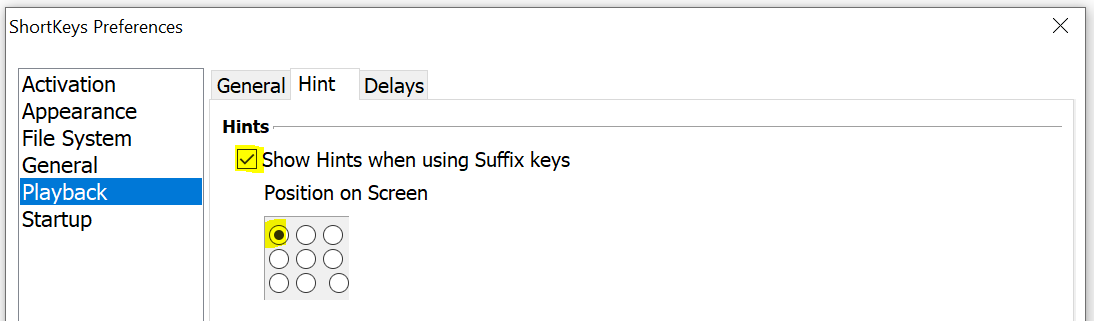 3. Click on the Hint tab. Select Show Hints when using Suffix keys and choose a location on the screen where the hint will display.