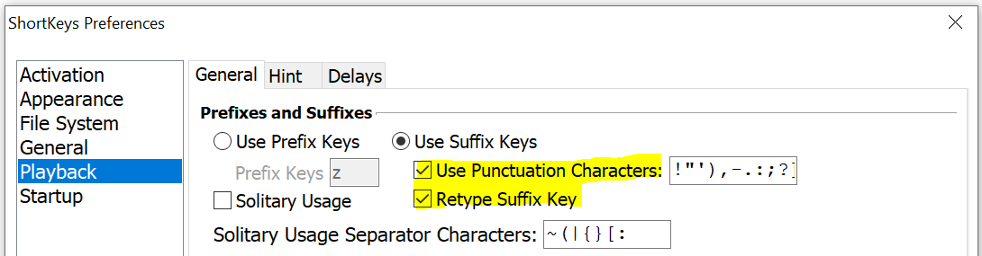 2. Click on the Use Punctuation Characters and Retype Suffix Key options. Click on the Apply button.