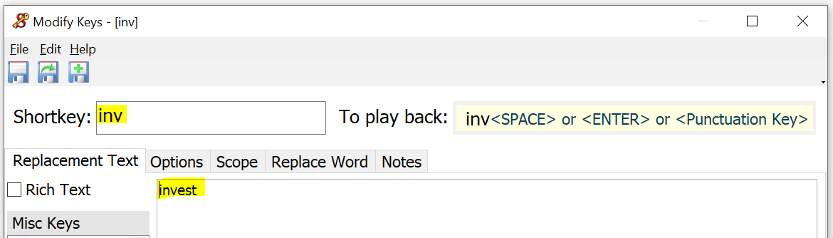 10. The inv shortkey is shown with a replacement text of invest. The suffix column displays the letters d,g and m.